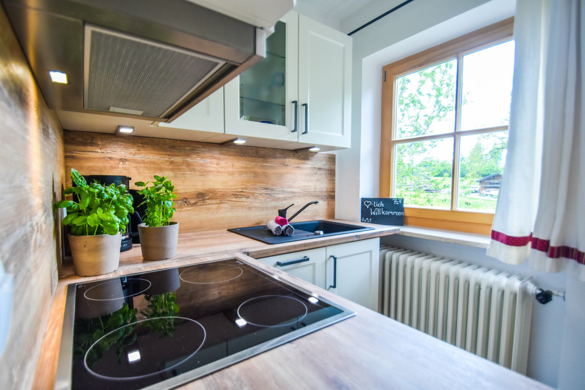 • Komplett ausgestattete Wohnküche mit Backofen, Spülmaschine, Kühlschrank, Eierkocher, Wasserkocher, Toaster, Kaffeemaschine